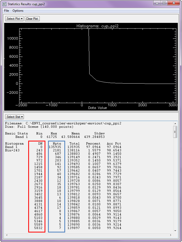 The ‘DN’ (outlined in the red box) that you see represents a specific pixel value, and the ‘Npts’ (blue box) values that you see represent the total number of times that specific pixel value was identified/found in the image. A high PPI value means it has been an endmember in more iterations.