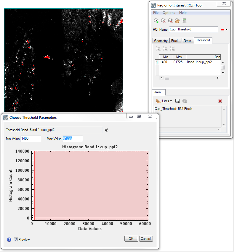 Using that value of 1000 we can apply a band threshold to the PPI image that will now only include pixels in the image with high pixel values and low frequency; in other words we will only be left with spectrally pure endmembers. Determining the exact PPI threshold value is made very easy with the new ROI Tool. When selecting a threshold the ENVI display window will dynamically update to colorize the pixels which contain the range of values stipulated in the Choose Threshold Parameters dialog window (the red pixels in the attached figure). The ROI Tool dialog also updates with area information to detail how many pixels are contained within this newly created ROI. Due to the nature of HSI data and pure endmembers we know that the total number of pixels contained in the ROI should be no more than a few hundred pixels. Using a threshold value of 1400 we will be left with only 534 pixels, a reasonable number in our case.