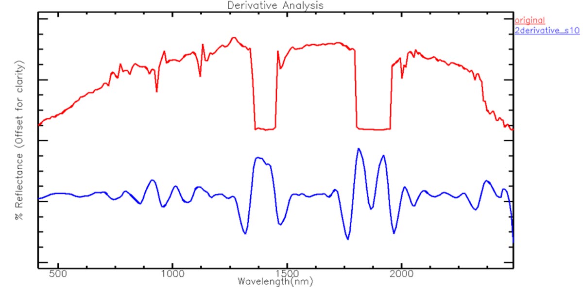 在这项工作中,通过在 ENVI 光谱剖面工具中使用导数光谱法,增强了一些重叠的吸收特征。导数光谱法在识别和表征重要矿物隐藏和重叠的吸收特征方面起着重要作用。导数光谱法还有助于减轻光谱中存在的噪声。
