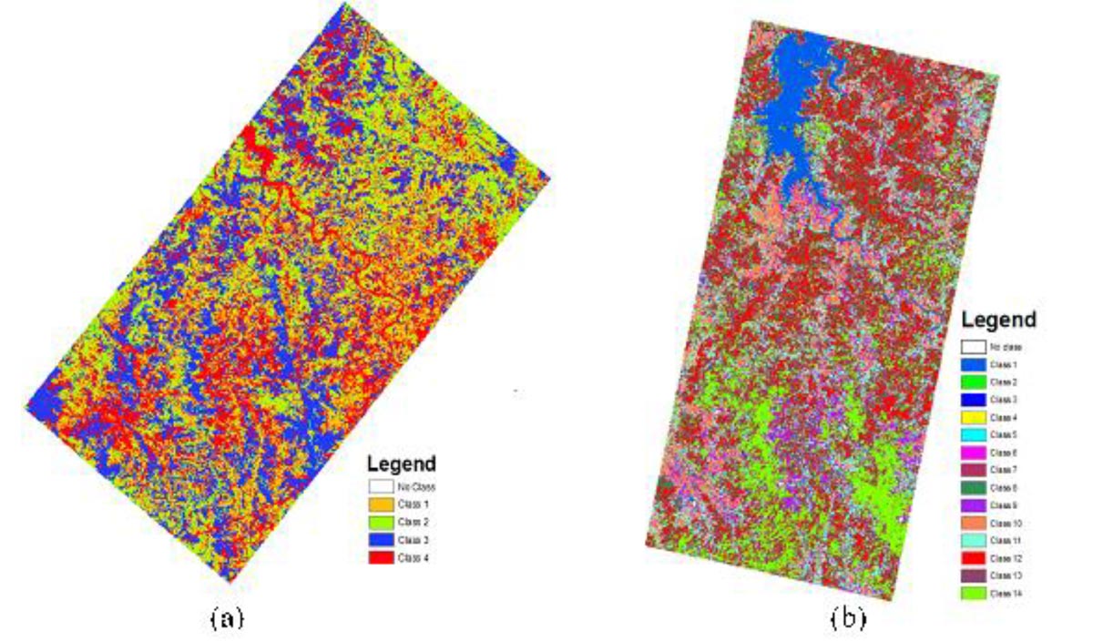 图 3. 对印度拉贾斯坦邦 DESIS 和 PRISMA 高光谱数据经 PCA-MNF-ICA 融合后的图像进行无监督分类。这些类别代表矿物类别。