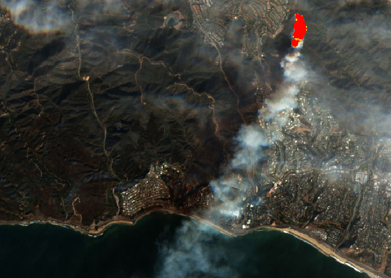 The image above shows a fire hotspot from the start of the Pacific Palisades wildfire on January 7. The hotspot was derived from a Sentinel-2 shortwave-infrared (SWIR) signature, displayed over a true-color image in ENVI.