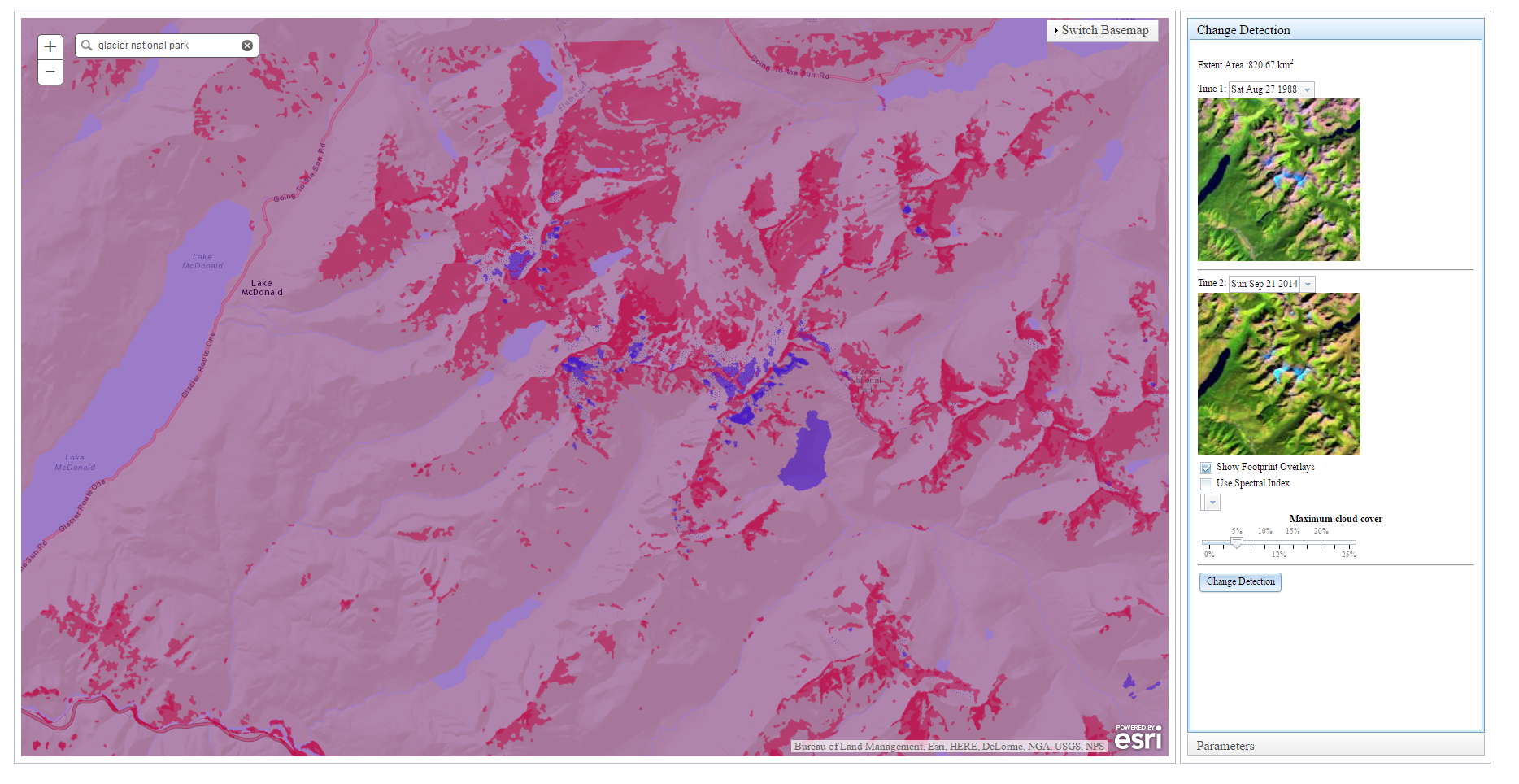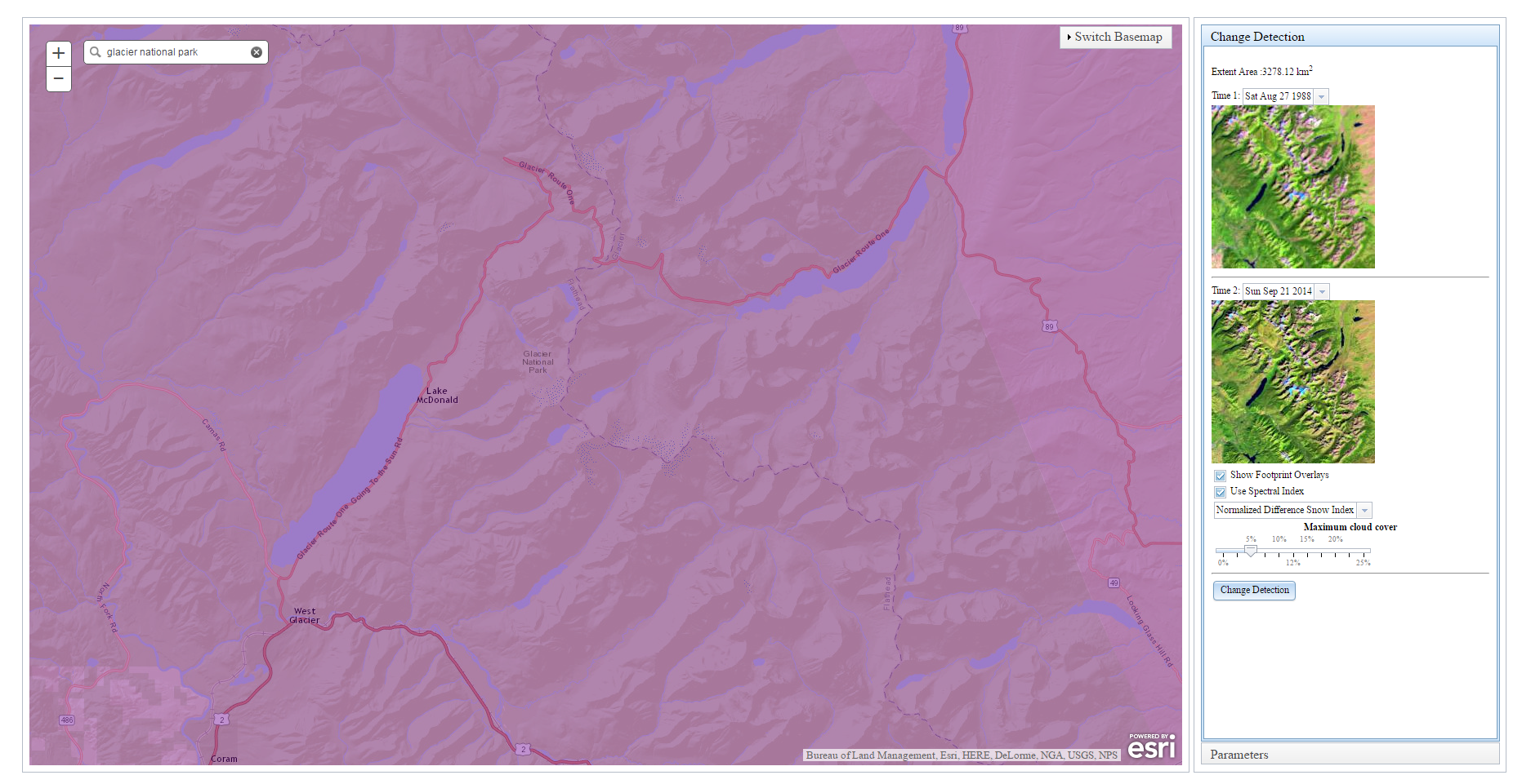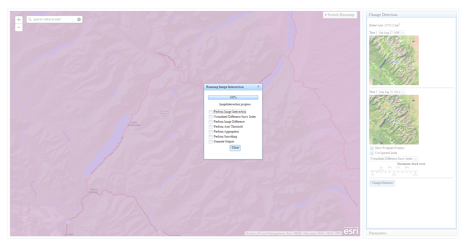 In the past few years we have started to see a shift to where users want to run the analysis where this data resides, for instance on applications like Amazon Web Services. As we continue to implement more and more ENVI tasks on Amazon Web Services, you can truly take your analysis to the where the data is. In the Change Detection example below, one of our engineers put together a quick interface utilizing ESRI basemaps to define the area of interest. By linking to ESRI’s endpoint (Landsat.arcgis.com) you can stream in the Landsat data available for that area of interest. In this example, we can search for the area we are interested in seeing (Glacier National Park), see what data is available during different years, filter out the data based upon cloud coverage, and then apply Spectral Indices if wanted: