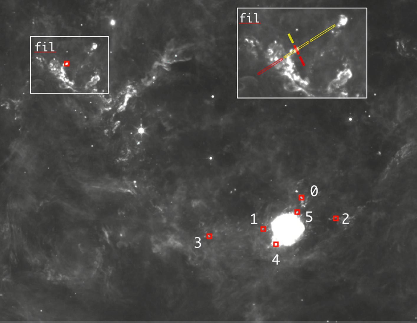 这幅24微米红外图像展示了围绕Cas A超新星遗迹的六个瞬态热点,大约拍摄于20年前。图像右下角四分之一区域的亮白色区域代表了膨胀碎片与其周围介质相互作用被加热而产生的红外辐射。用矩形框突出显示的回波6在右上角的插图中显示得更详细,插图中还描绘了望远镜上狭缝的位置。