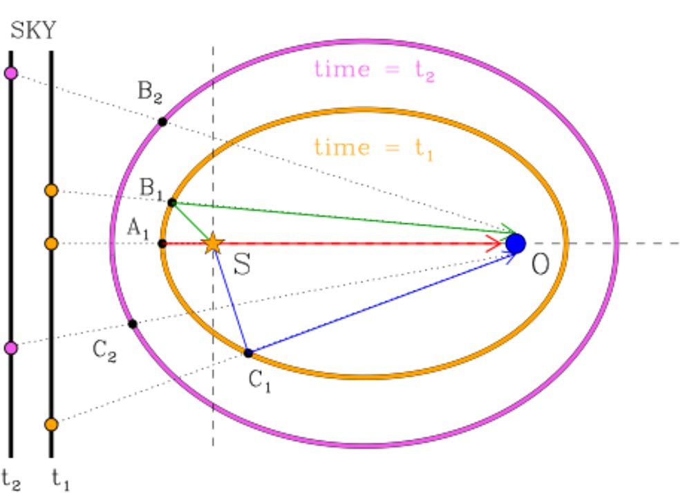 所有具有相同时间延迟的点都位于一个以S和O为焦点的椭圆(橙色)上。例如,通过A1点到达O的光,其延迟时间为光从S传播到A1再返回S所需的时间。同样,来自B1和C1的光与A1具有相同的延迟时间,这意味着观测者会同时看到来自A1、B1和C1的发射。