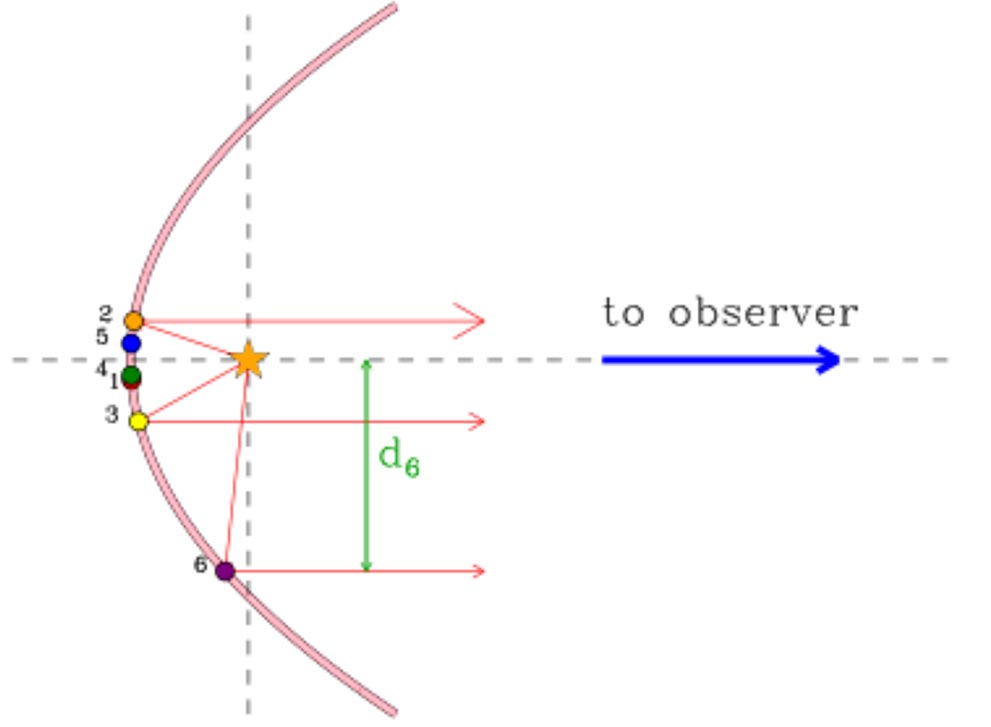 图1中所示的热点位于距光源S的确定投影距离处。例如,距离d6代表回波6距光源的投影距离。回波还必须位于一个椭圆上,其中距离S-A1(图2)对应340年的延迟——即该路径光传播时间的两倍。这使得回波6与爆炸恒星的距离唯一确定,同样的方法也适用于所有其他回波。