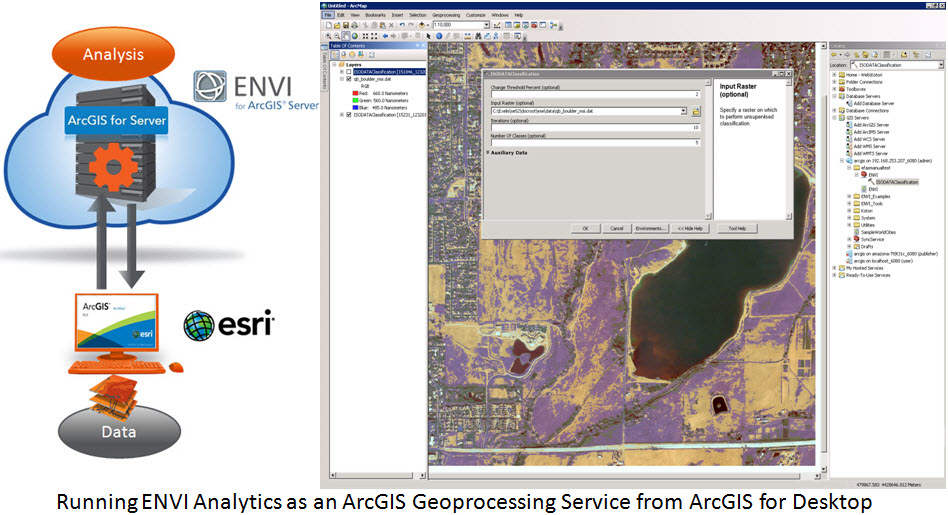 In a previous blog post I spoke about the interoperability between ENVI and ArcGIS® for Desktop. This included things like data format support, drag and drop of data between interfaces, single-click push of ENVI derived data to ArcGIS, and the ability to run ENVI analytics from directly within the ArcGIS desktop software. Now I'd like to go over some of the ways that ENVI plays well with ArcGIS for Server, and how users can utilize this interoperability to streamline workflows.