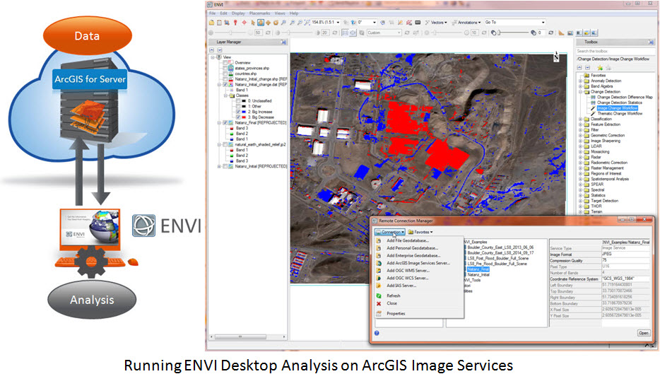 Access is made using the ENVI Remote Connection Manager, which allows you to connect to your ArcGIS for Server and access the data contained there. Once you've connected to your dataset(s), you can use any of the analysis tools available in ENVI to analyze the data behind the service, bringing results local for further analysis. Once the data has been accessed and analyzed, you can then push your derived results over to ArcGIS desktop using the afore-mentioned desktop interoperability, and publish those results back to your ArcGIS for Server for dissemination. This enables any image service with the full suite of analysis tools available in ENVI, and provides a quick method for getting those results back into ArcGIS for Server and shared with the rest of your organization.