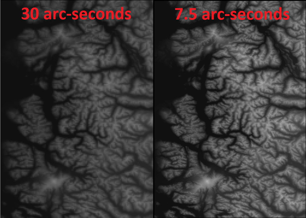 To replace the GMTED2010 dataset in the ENVI software installation with this higher spatial resolution 7.5 arc-seconds version simply overwrite the "GMTED2010.jp2" file in the appropriate path based on computing platform listed above (may require administrative privileges). Here is a screenshot of the 30 arc-seconds dataset distributed as part of the ENVI software installation (left) and the upgraded 7.5 arc-seconds version (right) that you will soon be able to download from our website: