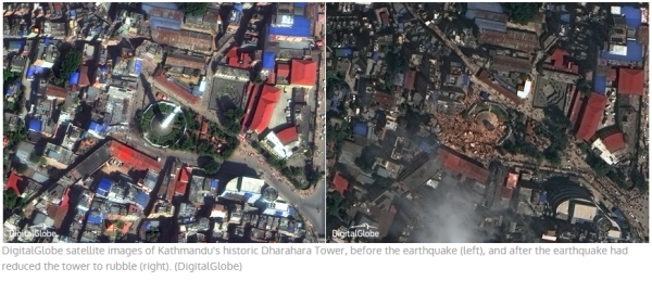 In response to the devastating 7.8 magnitude earthquake that struck central Nepal on April 25, DigitalGlobe has made high resolution satellite imagery of the affected areas freely available online to all groups involved in the response and recovery effort. This imagery can be accessed via https://services.digitalglobe.com/myDigitalGlobe/login. For more information on how to access DigitalGlobe high resolution imagery to aid in recovery efforts, see this blog post.