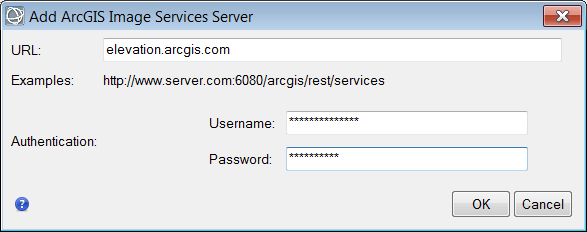 In the resulting dialog I enter "elevation.arcgis.com" in the URL field followed by my ArcGIS Online username and password then press the "OK" button: