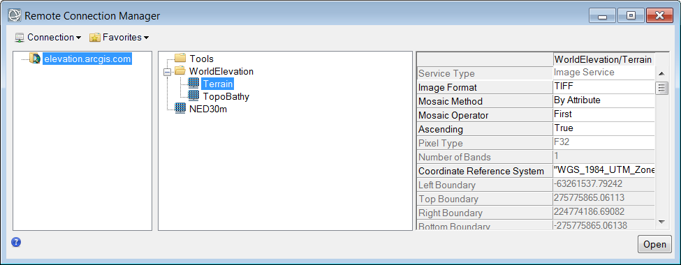 Back in the Remote Connection Manager dialog I see a "Retrieving Information..." message while ENVI is communicating with the ArcGIS Online server. Once the necessary information on the available image services is obtained I can select the Terrain dataset. In order to open the real 32-bit floating-point terrain data from this image service (which is what I want for RPC orthorectification processing) I need to change the "Image Format" parameter to "TIFF" before pressing the "Open" button: