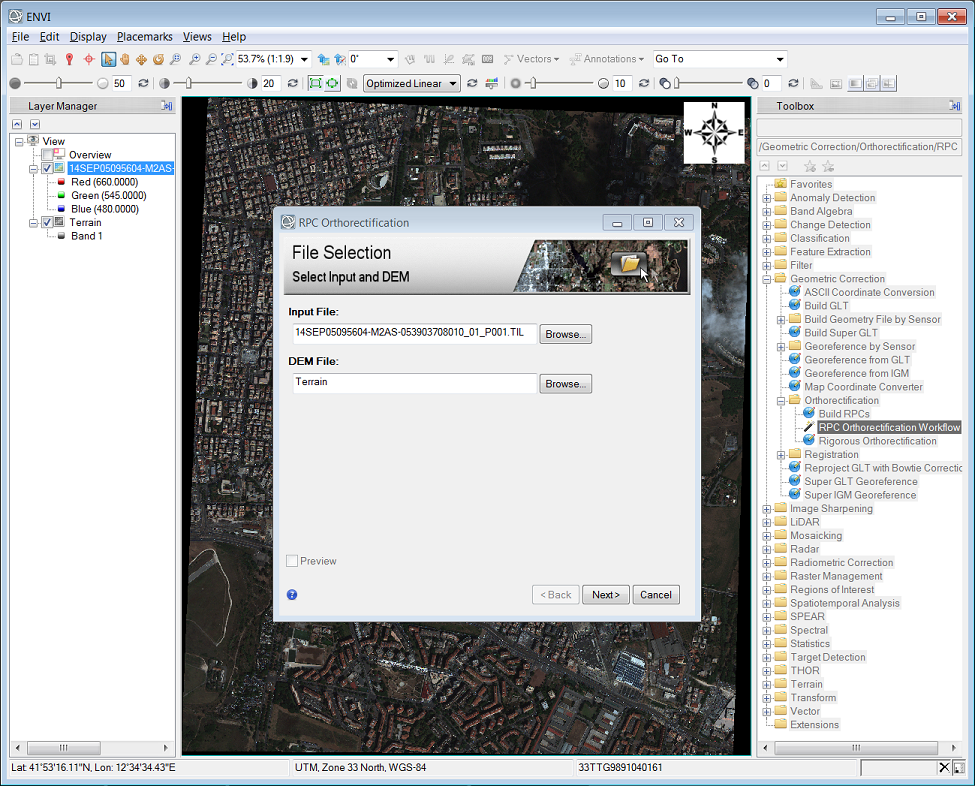Once the "Terrain" raster dataset layer is loaded and displayed I can close the Remote Connection Manager dialog (it also helps to drag the WorldView-3 image back on top in the Layer Manager so it is visible). Next I launch "Geometric Correction/Orthorectification/RPC Orthorectification Workflow" from the ENVI toolbox along the right-hand side (Hint: simply enter "rpc ortho" in the "Search the toolbox" at the top-right). By default the RPC Orthorectification workflow will use the "GMTED2010.jp2" file included in the ENVI software installation so next to the "DEM File" box I need to press the "Browse..." button then select "Band 1" under the "Terrain" raster dataset: