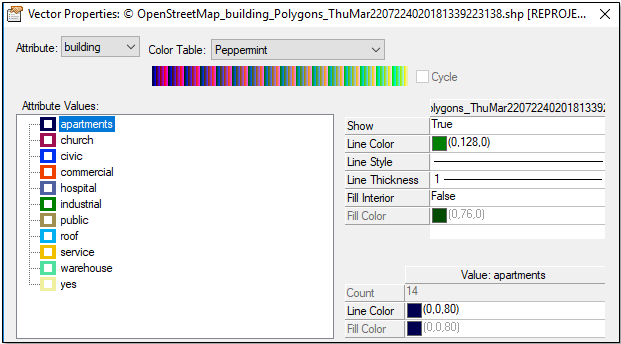 Another useful thing about the addition of OSM data, is the capability to edit the symbology of vectors. To edit the symbology of a feature, double-click the name of the feature in the layer manager and select properties, from there you can select the Vector Properties dialog to change the color, size and style of the features. You can also edit secondary features using the Attribute drop-down list in the Vector Properties dialog. To do this just select an attribute from the Attribute Values list and change the properties of the secondary feature as needed. Changing the symbology of OSM vectors can add more meaning to a result and can help with the visualization of a map output.