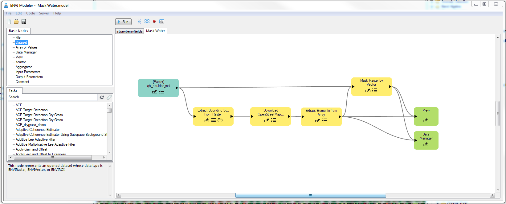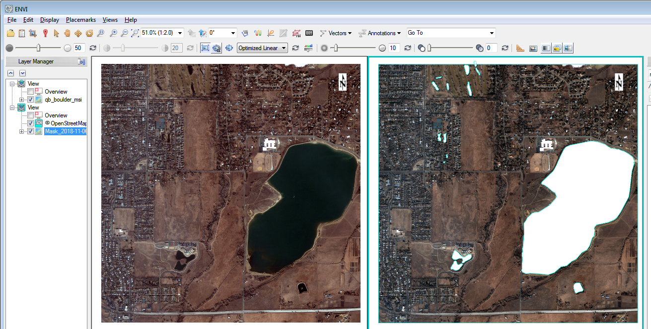 One unique way to take advantage of OSM datasets is to use the water vector layer to quickly mask out water in an image. My colleague, Eduardo Iturrate, created a simple model using ENVI Modeler to mask out water in a Quick Bird image over Boulder, Colorado (below). This model was done by extracting a bounding box from the raster image, downloading the OSM data for the image ROI, extracting the specific water layer from the OSM data array and then proceeding to mask the raster with the OSM water vector layer.