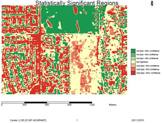 The Hotspot Analysis tool uses a scoring system to determine the most important "Hotspots" in a image that is generated from a vegetation index. In this case we used NDVI for plant health. The large green region at the top of the image is a golf course.