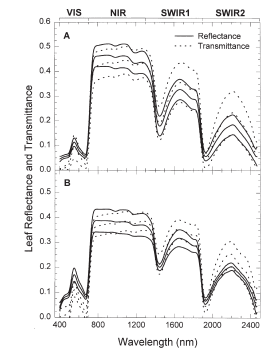 The SWIR range of the EM spectrum allows the user to see certain absorption features very clearly due to certain materials only displaying absorption features in that range, which allows you to determine vegetation health as well as delineate between soil and decaying canopy. As we stated above you can identify the relative health of a plant based off of how green/yellow/red the leaves appear. Looking at a spectral profile comparing decayed leaf spectra and soil in the visible range it is relatively difficult to see the difference in surface reflectance. When you include portions of the SWIR range in the spectral profile the surface reflectance values are clearly different. The top plot shows the mean leaf hemispherical reflectance and transmittance properties collected from sites in the US and Brazil of a woody plant species, and the bottom plot shows reflectance and transmittance for herbaceous species. The plot below shows the increase in absorption features and spectral features present in the SWIR compared to the Visible and NIR range.