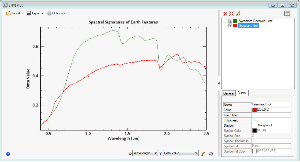 ENVI can easily display spectra from libraries as well as from your own pixel data. Identifying these spectral features and then understanding what causes them is essential to any advanced image analysis workflow. This is but a small demonstration of the power of SWIR data focusing on a single absorption feature. For more information be sure to peruse the many papers published on SWIR data as it applies to vegetation and agriculture.
