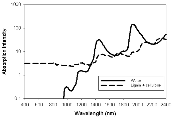 The SWIR range is roughly 1400-3000 nanometers. Historically this range of the EM spectrum has been used for material detection and identification in the fields of minerology, geology and land management. In the late 1990's work improved on identifying specific ranges within the SWIR that can be used to determine vegetative health, water content, carbon content, etc. The figure you see below contains reflectance spectra for water and lignin + cellulose in the visible, near-infrared and short-wave-infrared regions. As you can see, many of the identifiable absorption features are found in the SWIR spectral region.