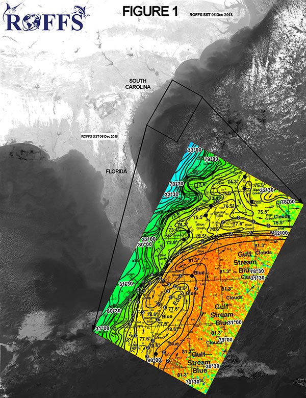 Figure 1 is a schematic showing the ENVI outputted sea surface temperature (SST) image of the Southeast United States region in grayscale (white = clouds, darker grey = warmer water). The outlined region in black is an example of a predefined cut out area offshore of South Carolina and Georgia within the Gulf Stream region. We further analyze the ocean conditions in this cut out area using internal techniques and provide an overall mapped product for the fisherman (shown in color). ROFFS™ incorporates a number of different satellite data products to derive the most important ocean parameters to guide the fishing community to the better offshore conditions to be most productive for their target species. The end result is blown up and shown in color where we provide a customized map displaying ocean frontal boundaries, water current flow, bottom structure, eddy features, SST and water color overlaid on detailed bottom structure and georeference information. Finally, based on all these factors and experience we pinpoint the locations with dots and stability information to where the best spots to fish are located. This saves our clients time and fuel and makes fishing trips more efficient and enjoyable.