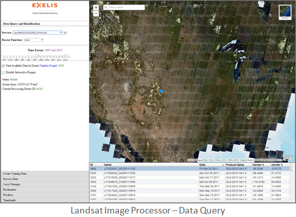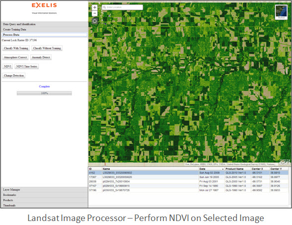 让我们快速浏览几个云端影像分析的示例。在第一个示例中(如下所示),使用 JavaScript 构建了一个简单的用户界面。利用由 Esri® 提供的 Landsat 影像服务来访问全分辨率多光谱 Landsat 影像。可以查询这些数据并将其显示在 Esri® 底图上。选定影像后,可以使用 ENVI Services Engine 提供的功能对数据运行各种影像处理选项。在下面的屏幕截图中,第一张图展示了查询 Landsat 影像服务数据目录的示例。第二张图展示了在选定影像上执行归一化植被指数 (NDVI) 的示例。在下图所示的配置中,执行影像分析时,输出数据存储在本地的服务器上,并创建一个 PNG 文件以在 Esri® 底图上显示结果。
