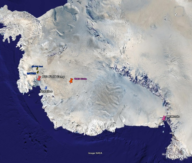 松岛冰川有一个延伸部分,称为松岛冰川冰架。这个冰架正在帮助将西南极冰盖排入位于南极洲西部的阿蒙森海。下面的示意图将有助于您建立参考框架(图片由NASA提供)。