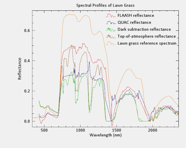 The following plot compares reflectance values of different correction methods for a single pixel of healthy vegetation from an EO-1 Hyperion image. The two most rigorous methods--QUAC and FLAASH--create reflectance profiles that more accurately represent healthy vegetation. The absorption features of FLAASH and QUAC results are closer to the reference spectrum, compared to dark subtraction and TOA reflectance.