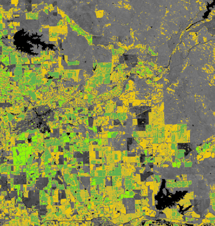 Green Vegetation Index (GVI) image created from a Landsat-8 scene of the Central Valley, California, 21 May 2015. The original scene was calibrated to spectral radiance, then QUAC atmospheric correction was applied before computing GVI.