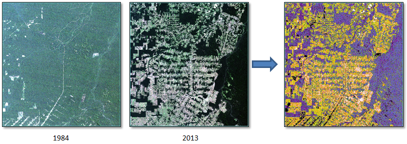 Image difference change detection between a Landsat TM image (1984) and Landsat-8 image (2013) of the Amazon rain forest. This process required radiometric normalization but no atmospheric correction.