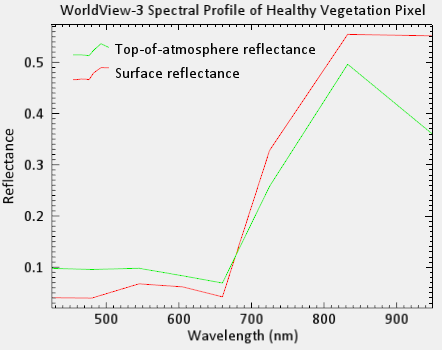 This difference illustrates the importance of removing atmospheric effects from a calibrated image. Here, the surface reflectance curve more accurately represents the characteristics of healthy vegetation with a steeper red edge curve near 700 nanometers, compared to the TOA reflectance curve. This highlights the role of remote sensing atmospheric correction in producing reliable data.