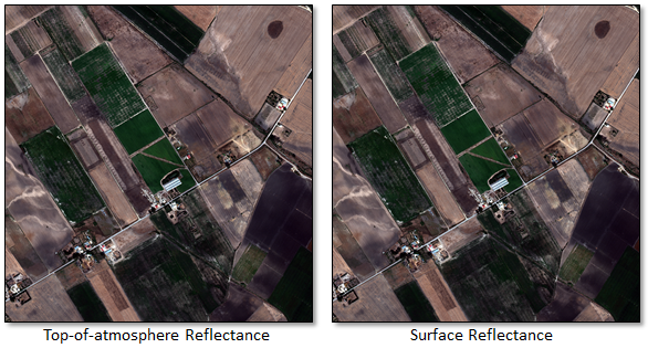 You can also calibrate imagery from some sensors to top-of-atmosphere (TOA) reflectance if sufficient metadata are available. See the article Digital Number, Radiance, and Reflectance for more information. Is it sufficient to calibrate an image to TOA reflectance without going through the process of creating a surface reflectance image? Look at the following WorldView-3 images, courtesy of DigitalGlobe. Both images were scaled from 0 to 1 in units of reflectance, and both are displayed with a 1% linear stretch: