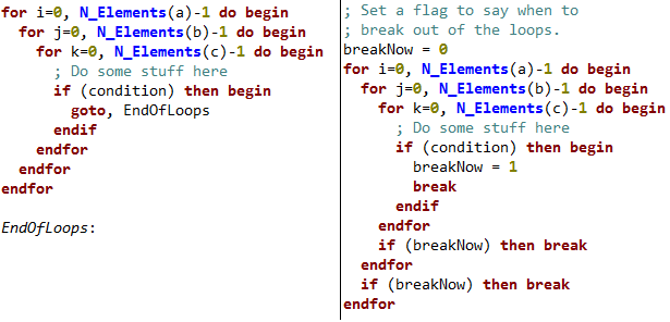 The BREAK statement is an easy way to immediately exit a loop. Unfortunately, though, it only exits the current loop, which isn't helpful in the case where you have multiple loops nested within each other. This is what it looks like with and without a goto. Note that the second example contains a special flag, just to indicate that you need to break from each loop.