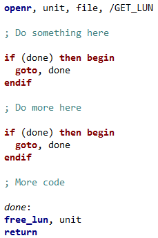The bottom line is that although goto can almost always be replaced by other forms of logic, it still exists today and is legitimate IDL syntax. There are quite a few hazards to it, but when used sparingly and with care, it can be a useful tool.