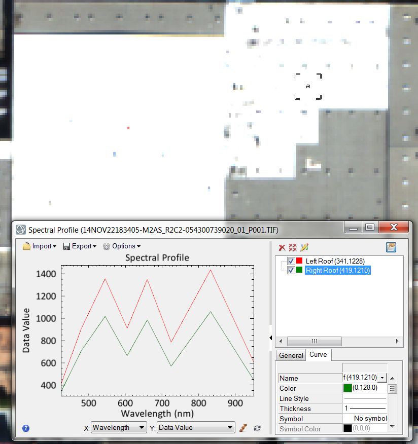 下图是使用 DigitalGlobe 提供的加州富勒顿地区的多光谱影像真彩色合成图创建的。从多光谱影像(MSI)来看,我们的两个屋顶似乎是由相同的白色材料制成的。即使我们显示这两个屋顶的光谱剖面,从多光谱影像来看,像素似乎只是在亮度上有所不同,并且具有相似的吸收特征。要是我们能扩展x轴的范围以包含更多的电磁波谱就好了……
