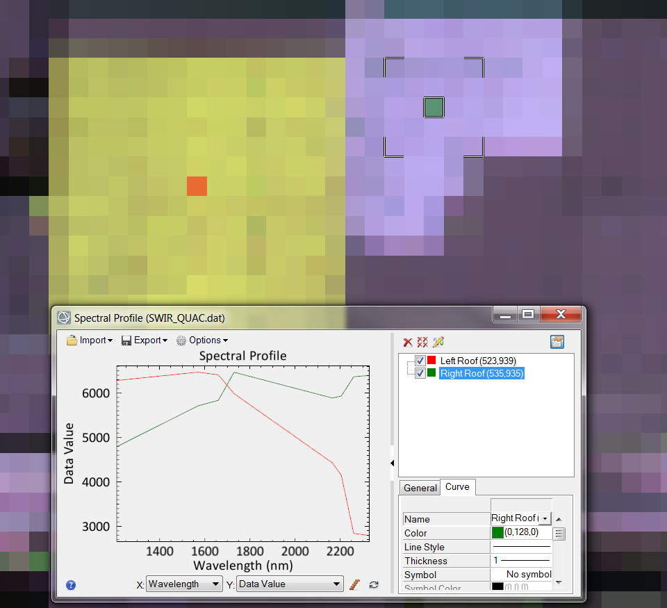 下图是通过将短波红外波段2(1570纳米)显示为红色、短波红外波段1(1210纳米)显示为蓝色、短波红外波段8(2330纳米)显示为绿色,在与上图相同的范围上创建而成。与多光谱数据相比,短波红外数据的像素尺寸更大,但短波红外数据增加的电磁波谱覆盖范围弥补了像素尺寸的不足。下图中的第一个明显差异是,这两个屋顶的颜色明显不同,这是由于在当前显示的短波红外波段中反射率值不同所致。右侧的屋顶呈现紫色,是因为该区域的像素在显示为蓝色和红色的波段(本例中为短波红外波段1和波段2)中具有高反射率值。左侧的屋顶呈现黄色,是因为该区域的像素在显示为红色和绿色的波段(本例中为短波红外波段2和波段8)中具有高反射率值。短波红外波段1和短波红外波段8中反射率值的差异,使我们能够查看这些屋顶材料类型的差异。如果没有能收集1400纳米以外反射率数据的传感器,我们将难以识别这些材料的差异。从这两个屋顶的光谱图可以很容易地看出它们是截然不同的材料。如果我们只有多光谱数据,就无法获得相同的光谱细节,从而在区别人造材料方面的能力就会受到更多限制。