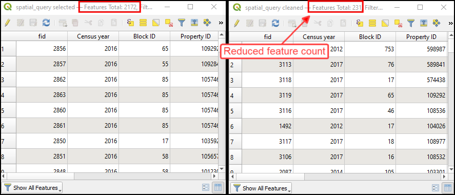 上一个查询完成了工作,你找到了缓冲区区域内的所有点。但你会注意到同一位置有许多重复点。经检查,你会发现源数据包含每个机构不同年份的多个要素。我们可以运行最终的 SQL 查询,通过为每个机构选择最新年份的要素来对数据进行去重。请注意,某些列名包含空格,因此我们将它们括在双引号中。