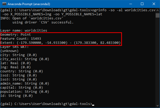 ogrinfo -so -al worldcities.csv -oo X_POSSIBLE_NAMES=lng -oo Y_POSSIBLE_NAMES=lat