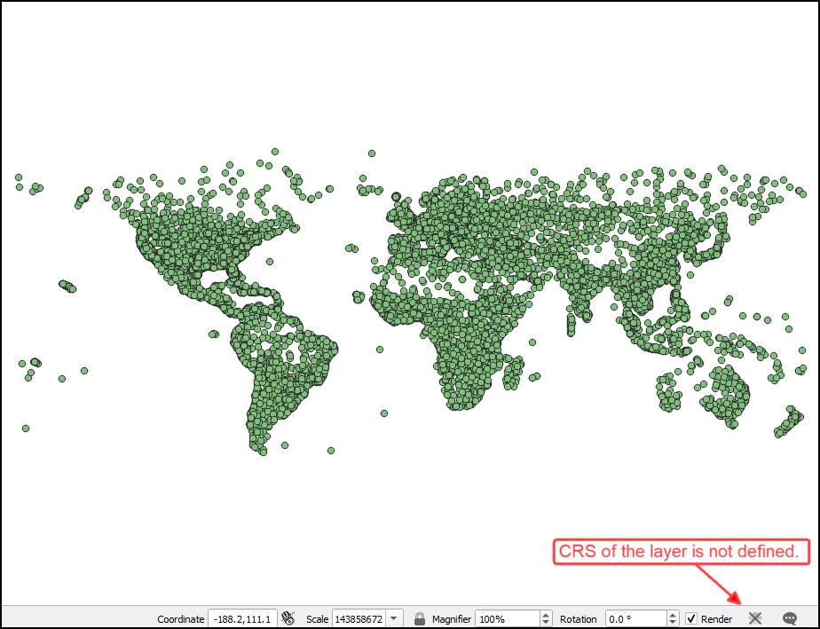我们可以在 GIS 软件中打开结果,它会显示城市图层。虽然点图层加载正常,但它缺少 CRS。我们可以使用 -a_srs 选项为生成的图层分配 CRS。