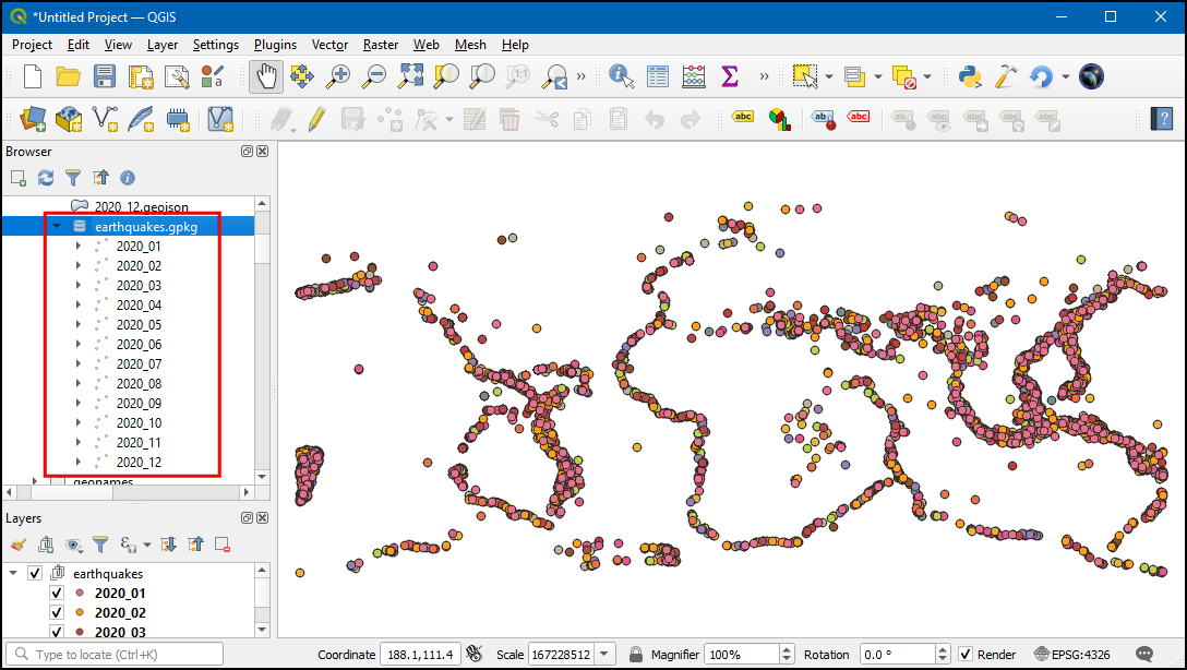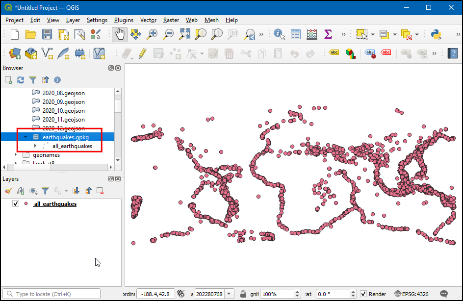 现在,GeoPackage 中将有一个名为 all_earthquakes 的单个图层,其中包含该年度记录的所有地震。